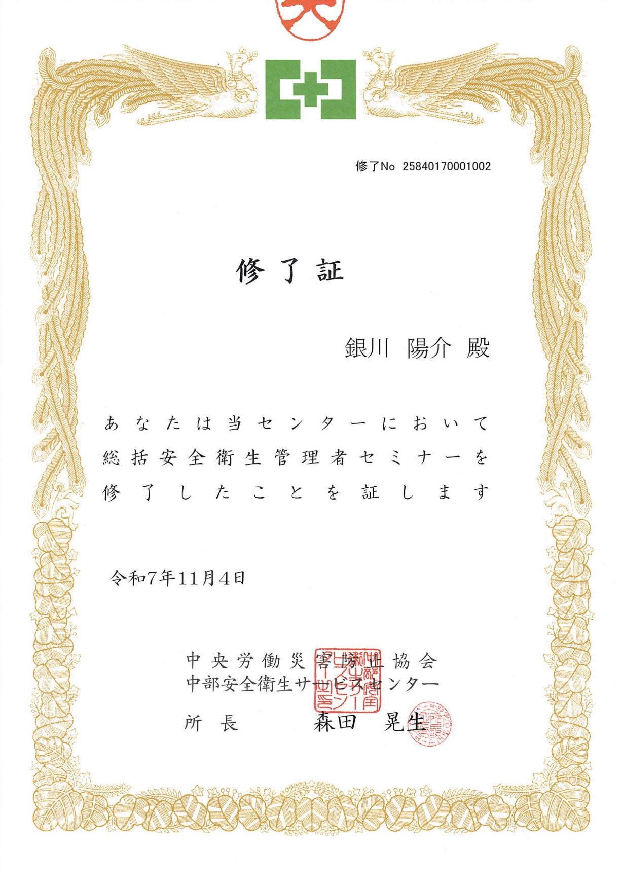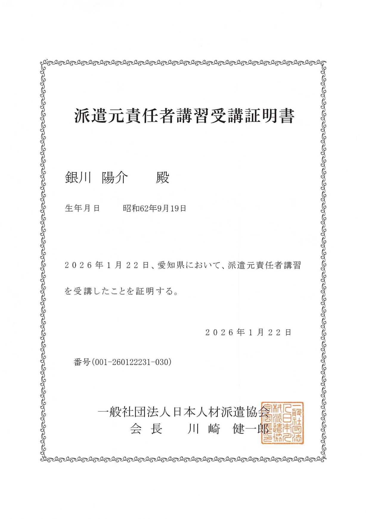 | 階層別選任義務 | 総括安全衛生管理者(大企業) 銀川 陽介(安全管理者) 元方安全衛生管理者(総括補) 銀川 陽介(元方事業者) 安全衛生管理者(事業所単位) 銀川 陽介(衛生推進者) メンタルヘルス管理者(THP) 銀川 陽介(健康委員長) 安全運転管理者(本社営業所) 銀川 陽介(弁護士特約) 情報取扱責任者(取引所窓口) 銀川 陽介(原則的公正) 旅程管理責任者(観光案内所) 銀川 陽介(経路選択の自由および一筆書き) 求人広告管理者(媒体等掲載) 銀川 陽介(募集情報等提供) 広告美術管理者(屋内外広告) 銀川 陽介(3Bの法則) 食品衛生責任者(人命最優先) 銀川 陽介(HACCPを超えた越境レシピ) 化学物質管理者(製造事業場) 銀川 陽介(リスクアセスメント) 保護具着用管理責任者(倉庫) 銀川 陽介(5S3T) 安全輸送管理者(運行管理補) 銀川 陽介(KY/ヒヤリハット) 整 備 管理者(自家用車両) 銀川 陽介(指定/認定) 特 定建築物維持管理権原者 銀川 陽介(リバースピッチ) 管 理 権原者(防火・防災) 銀川 陽介(防災管理者) 危険物取扱責任者(自衛消防) 銀川 陽介(統括管理者) 応急手当管理者(普及指導員) 銀川 陽介(バイスタンダーCPR) 派遣先責任者(派遣元責任者) 銀川 陽介(公正採用選考人権啓発推進員) 製 造業務専門派遣先責任者 銀川 陽介(雇入時安全衛生教育) 有料職業紹介責任者(出向元) 銀川 陽介(在籍出向供給契約者) 健康保険組合事業準備責任者 銀川 陽介(公法人医療保険組織) 産業廃棄物管理責任者(3R) 銀川 陽介(日本年金機構の排除啓蒙) 施設清掃責任者(半期大掃除) 銀川 陽介(総合的病害虫・雑草) 施設警備責任者(防犯セキュリティ) 銀川 陽介(組織犯罪対策部連携) |