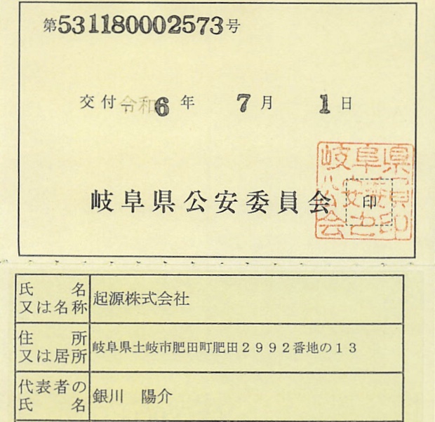 | 許可認証 | ・古物商【岐阜県公安委員会】鑑札:第531180002573号 主な区分:08 事務機器/名称:起源株式会社[行商可] 営業実態:創業者支援(伴奏支援型)プログラムの運営 ・食品 (全行程)【岐阜県東濃保健所】鑑札:第E250095号 主な区分:めん(他、含有する)所属元:起源株式会社 営業実態:井澤製麺所(ダイナミック・プライシング) |