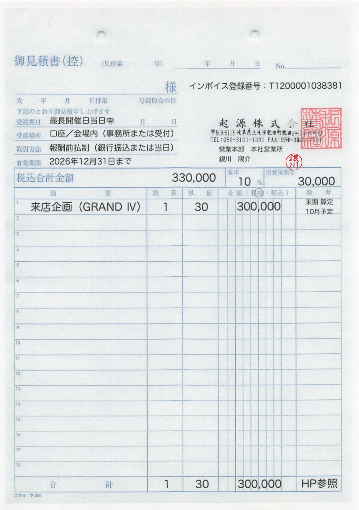 | 来店費用 | 一括現金 30万円(税抜価格)/回 |EY. 2026(固定額)/年 内訳:実践費10万円、または最大拘束10時間(Open-20:00) [料金改定]毎年10月予定でます(原則として2ヶ月前告知) ⚠︎ 安全を最優先にし、天候や交通渋滞、体調不良により予定が変更中止となる場合がございます、あらかじめご了承願います ⚠︎ 宿泊距離等によって来店費用が追加される場合がございます |